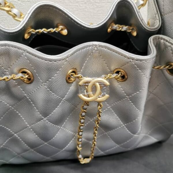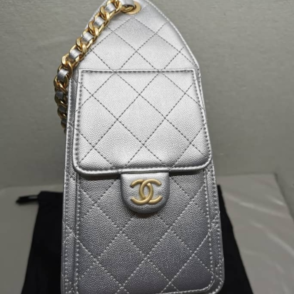 Chanel 25 Small Handbag Metallic Grained & Gold-Tone Metal Silver AS5293 B20405 NZV67 / 26 cm / 10.2 inches