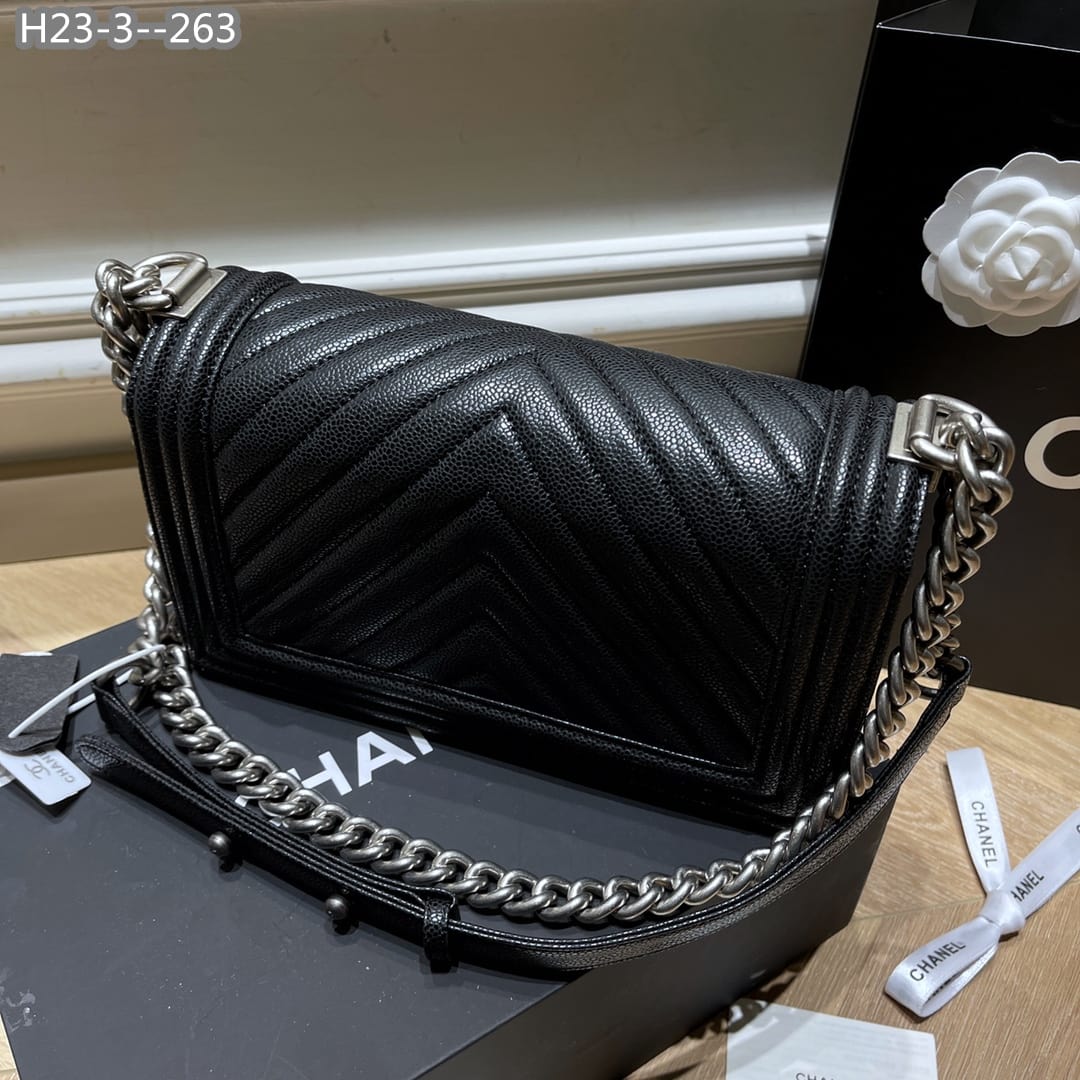 Chanel Boy Caviar Chevron Quilted Flap Bag / Black 25Cm