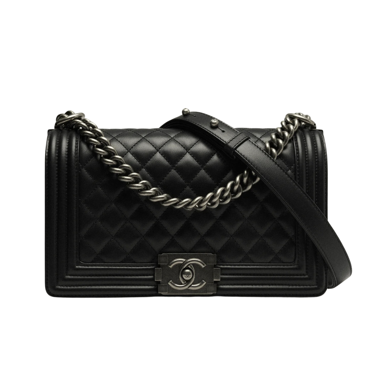 CHANEL BOY MEDIUM HANDBAG BLACK SLIVER HARDWARE A67086 Y09953 94305 / 25 CM / 5.9 INCHES