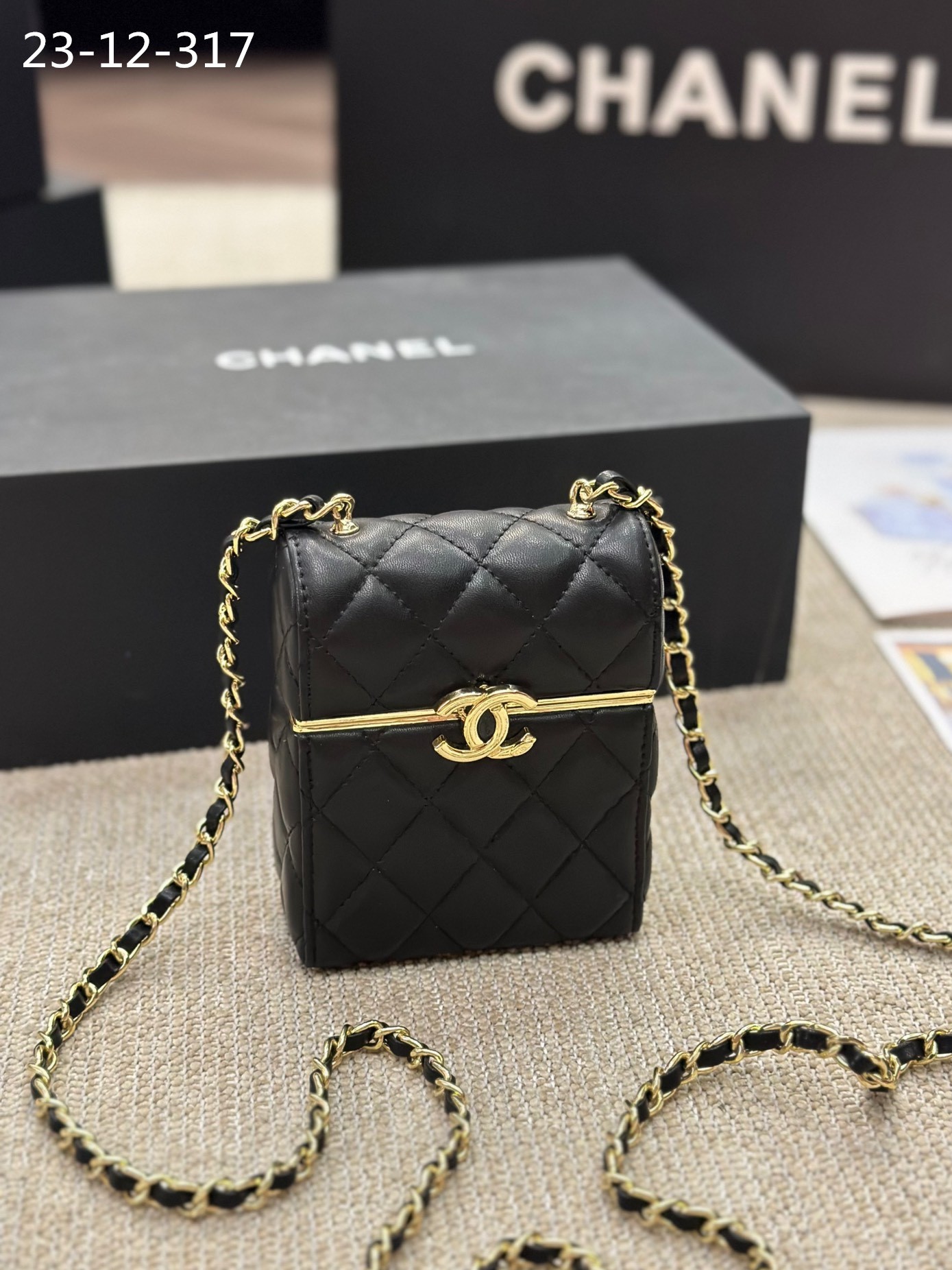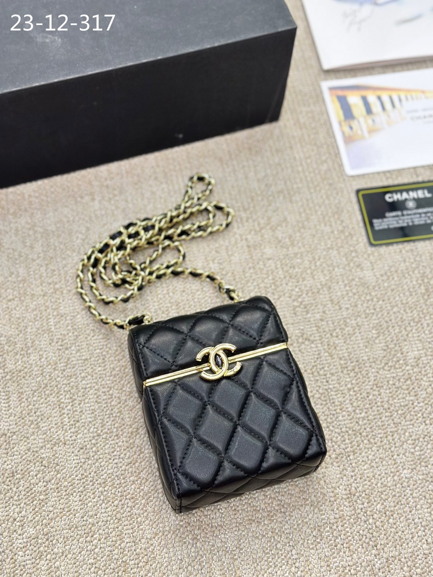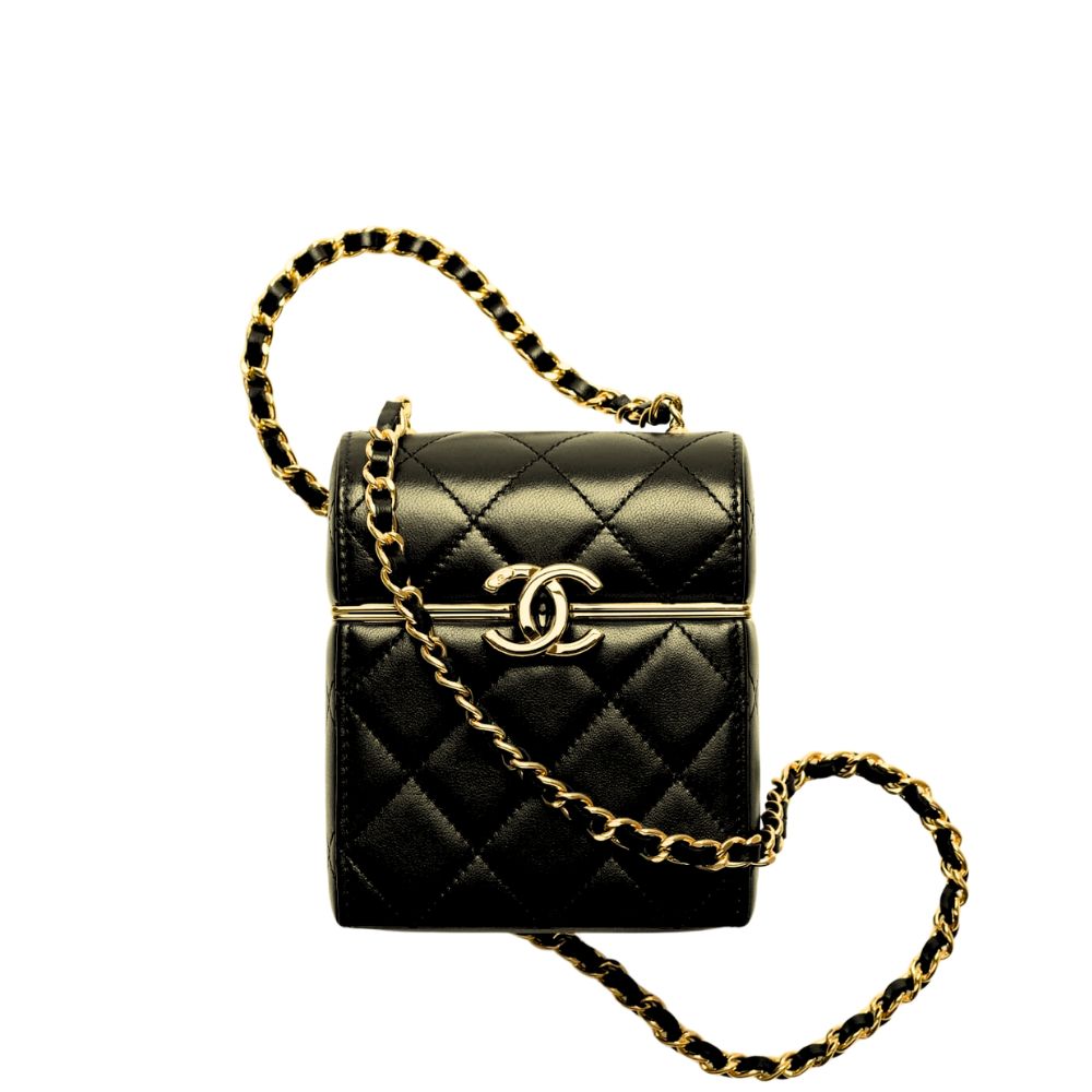 CHANEL SMALL BOX WITH CHAIN GOLD HARDWARE BLACK 13CM