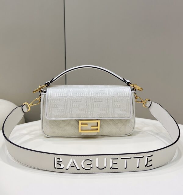 - Baguette bag made of white canvas with an raised FF motif created with tone on tone embroidery, trimmed in matching-colour leather and adorned with an FF clasp.