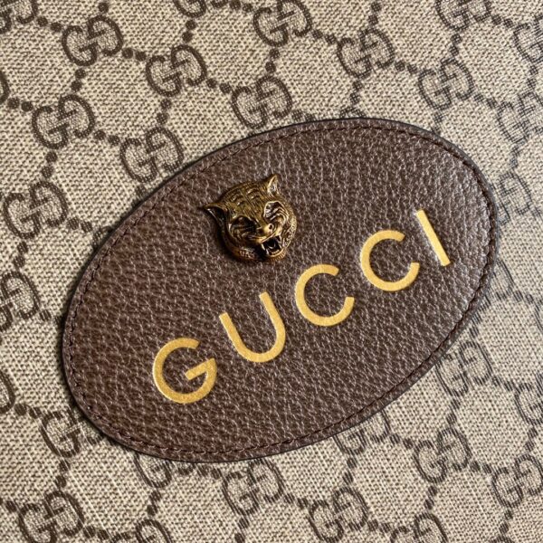 - Oval Gucci leather tag with feline head