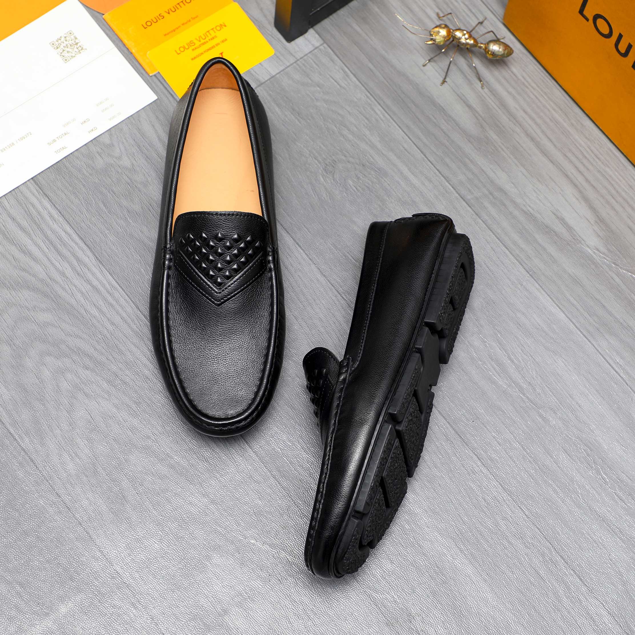 LOUIS VUITTON LOAFERS EMBOSSED LEATHER MOCCASIN BLACK