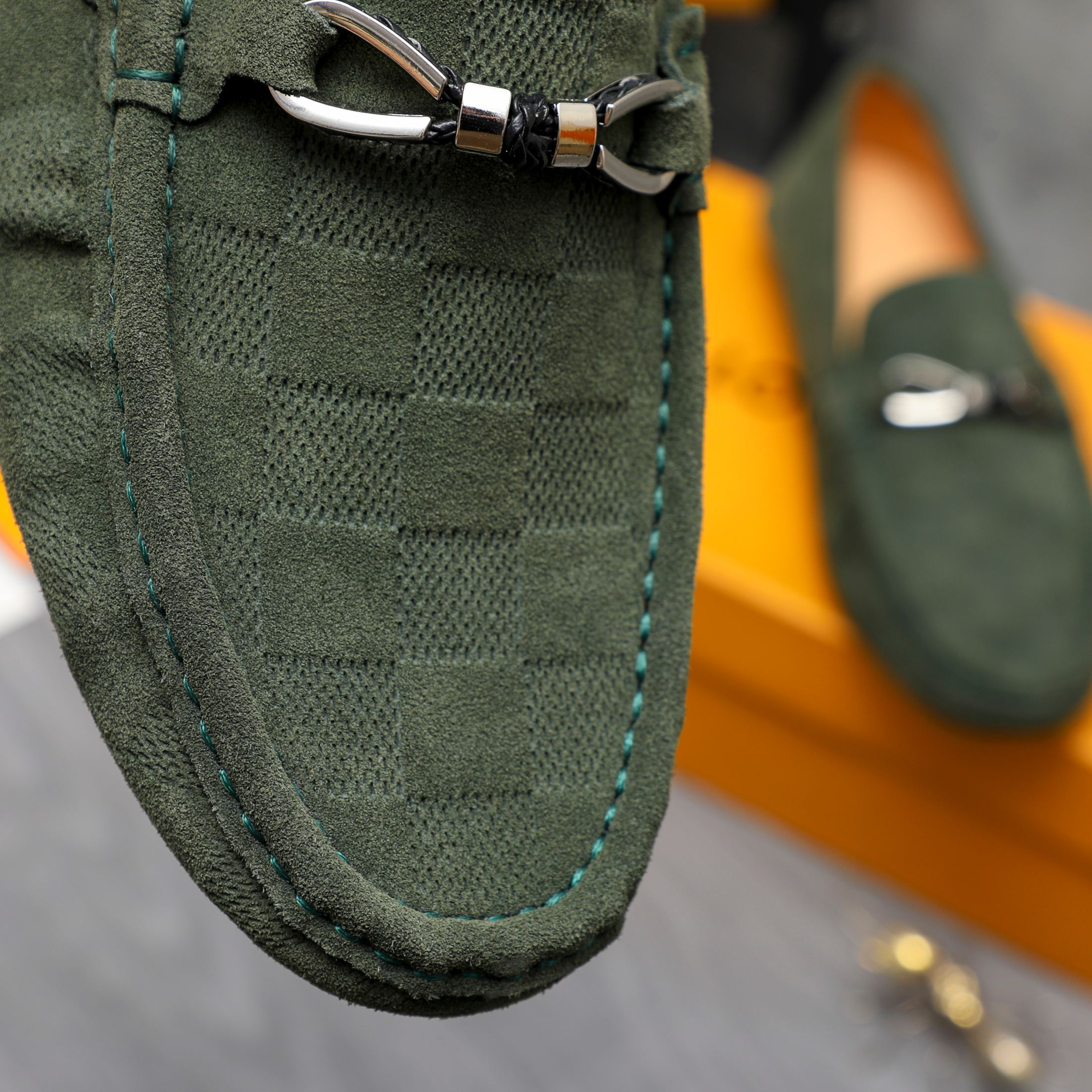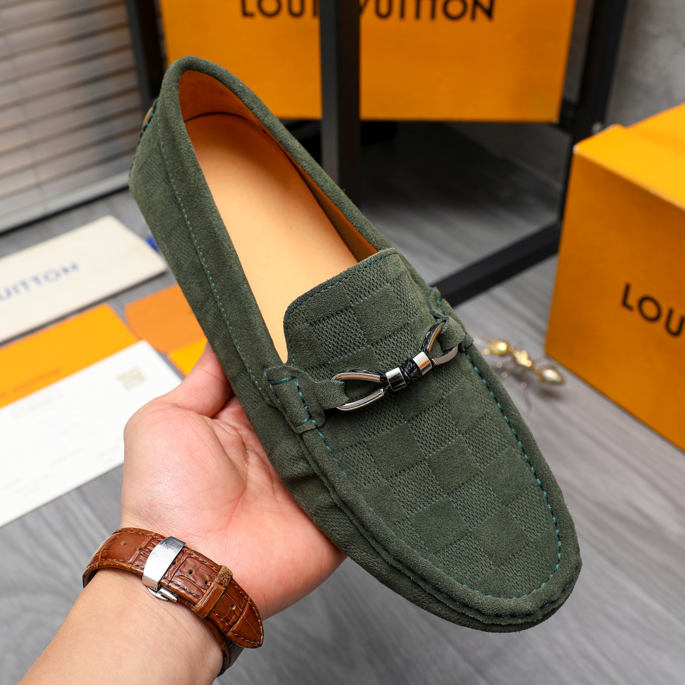 LOUIS VUITTON LV DAMIER SUEDE LEATHER LOAFERS IN DARK GREEN