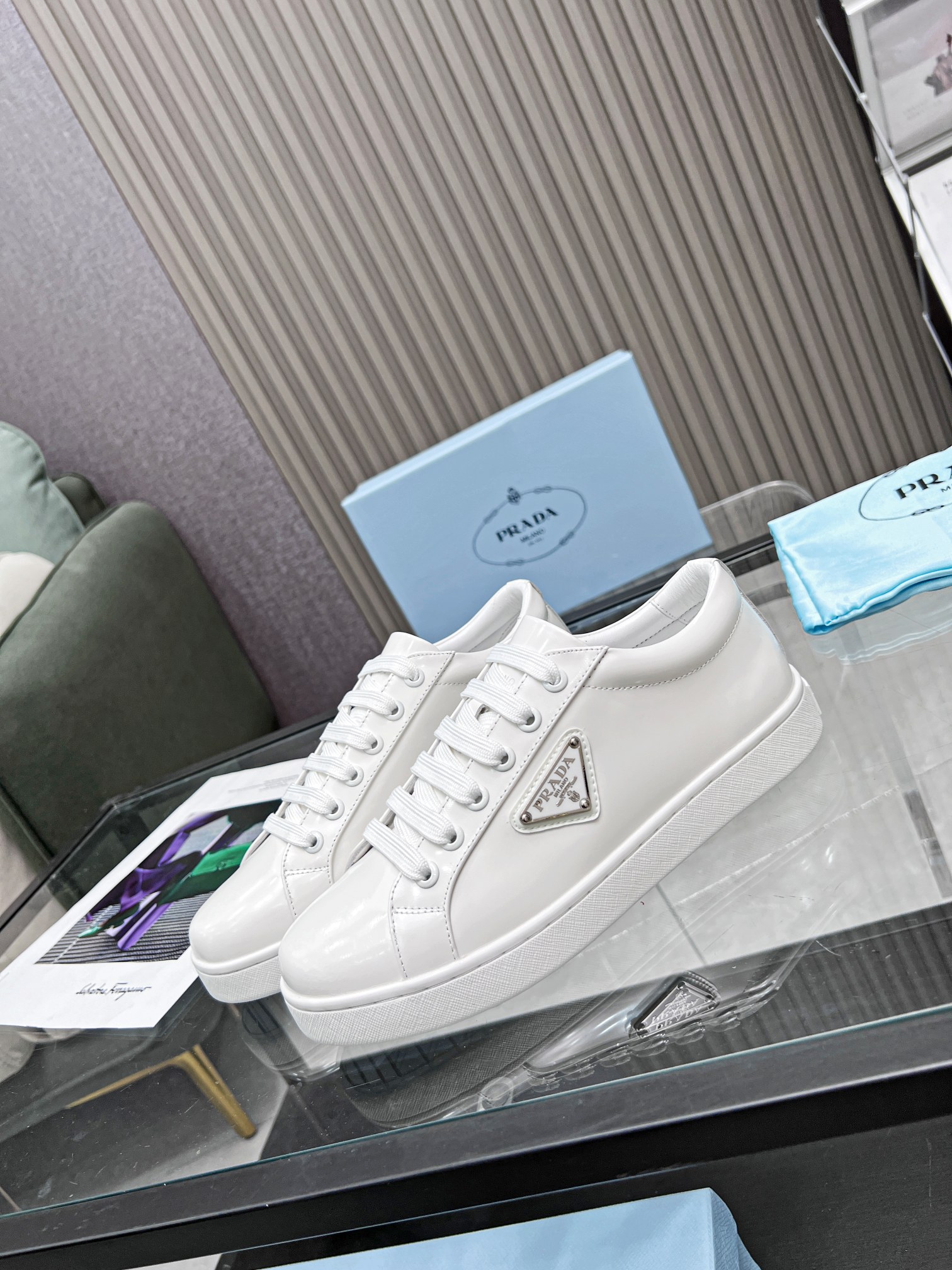 PRADA LOGO SNEAKERS IN BRUSHED LEATHER WHITE