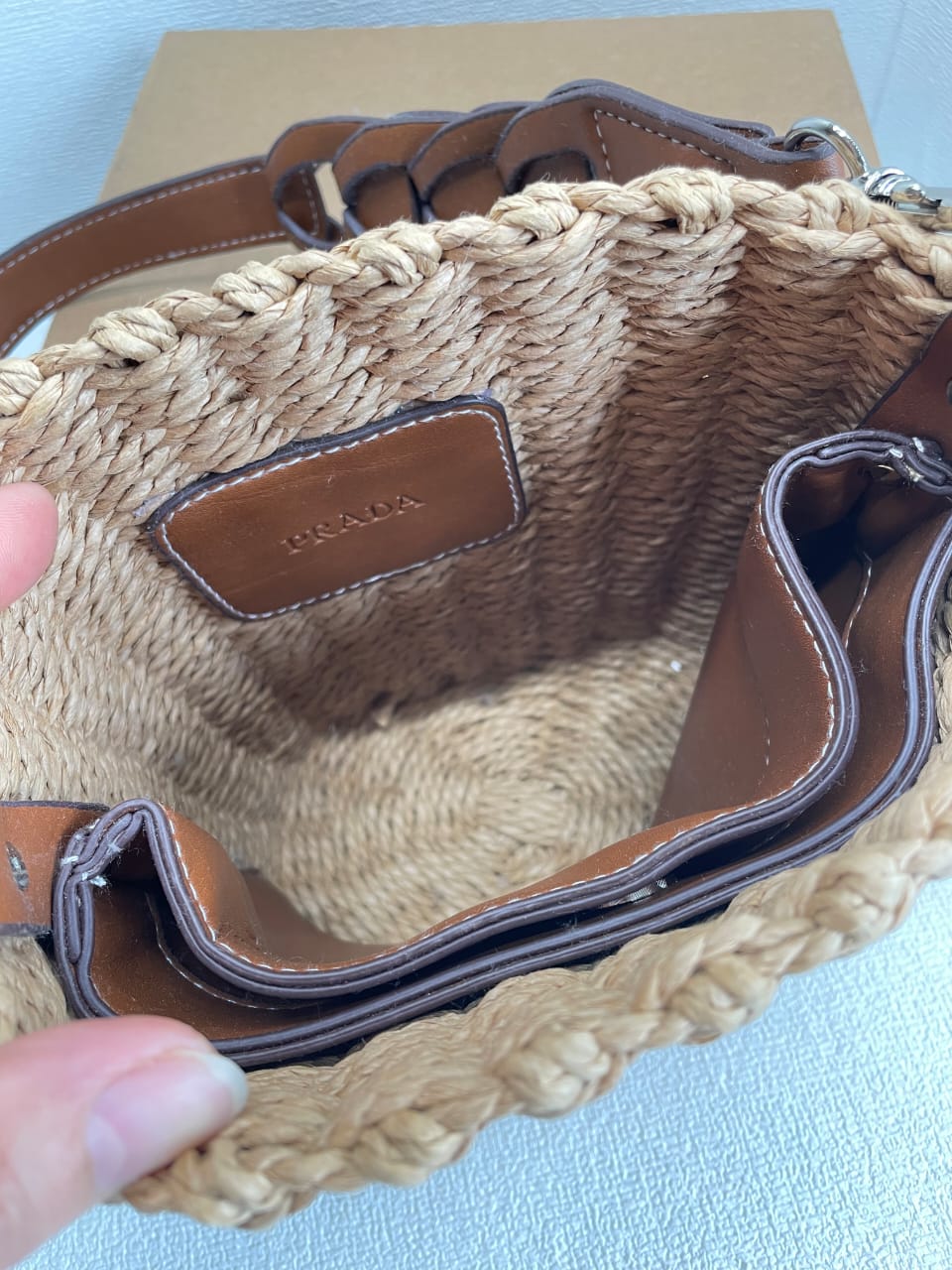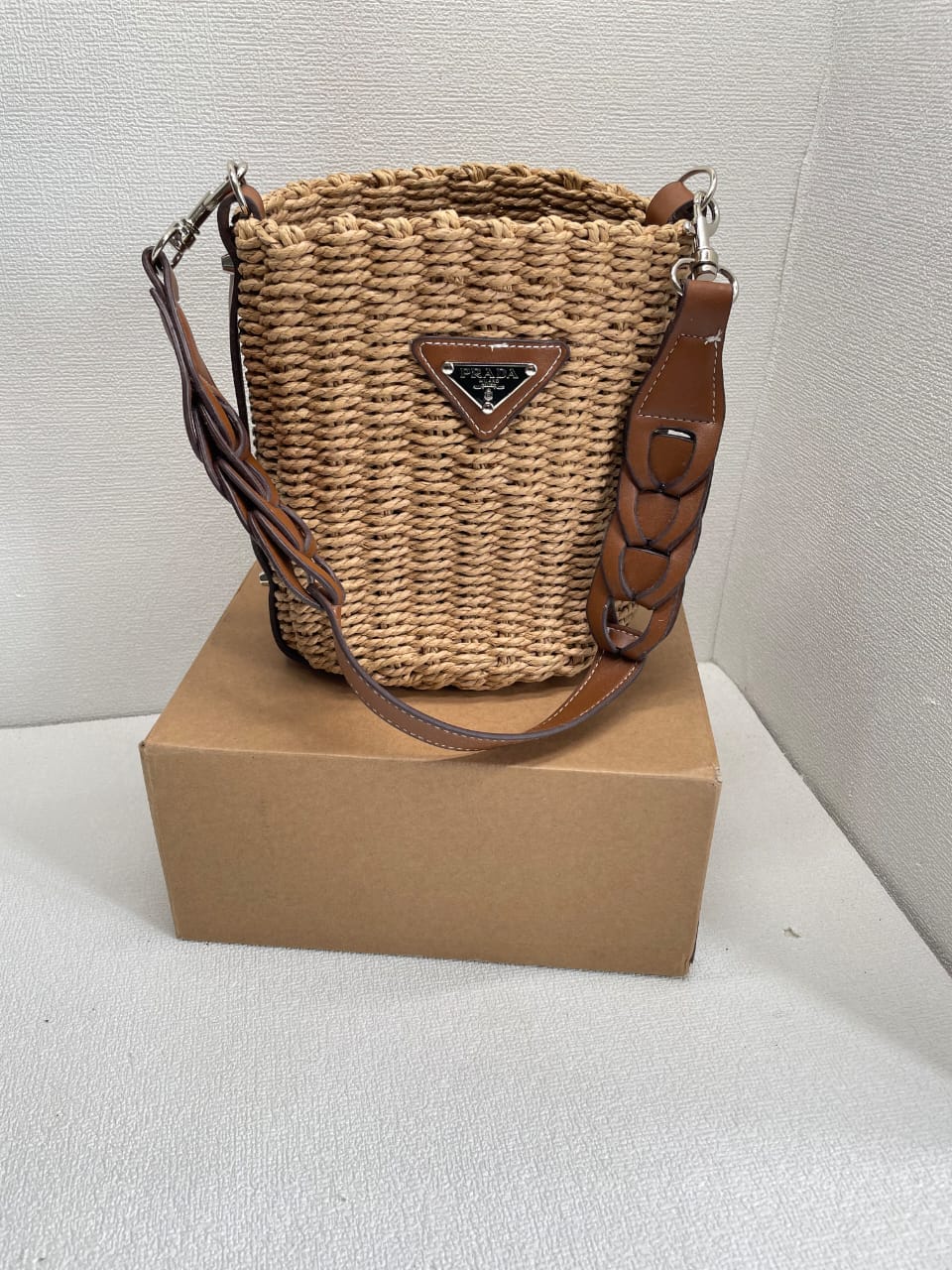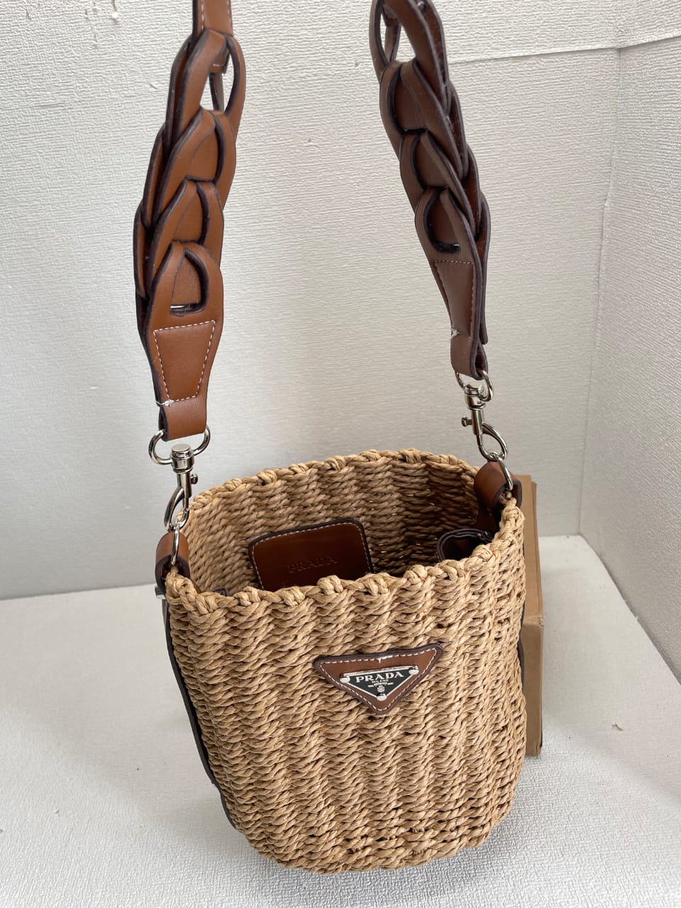 PRADA RAFFIA AND LEATHER BUCKET BAG 21CM