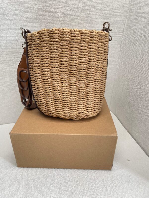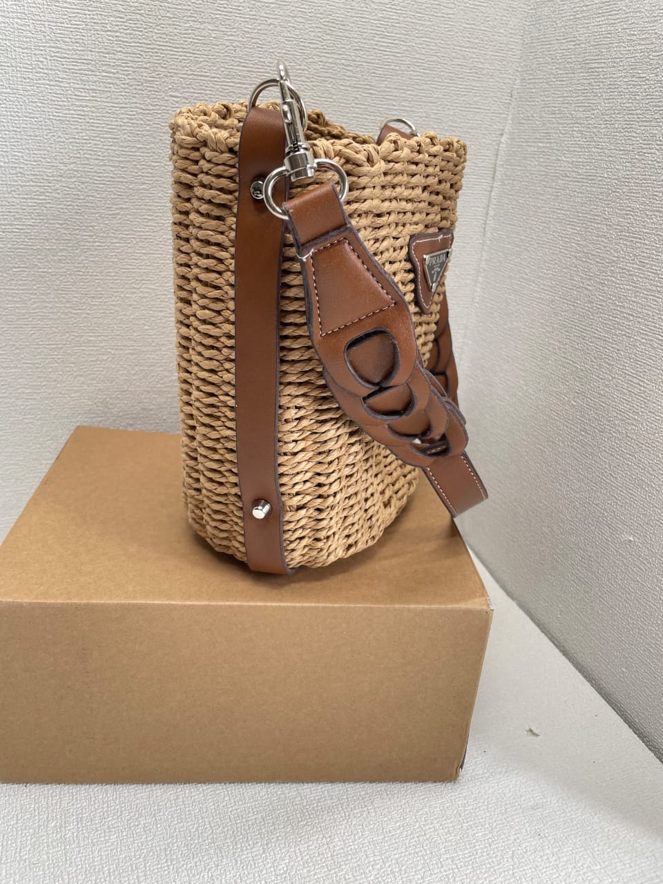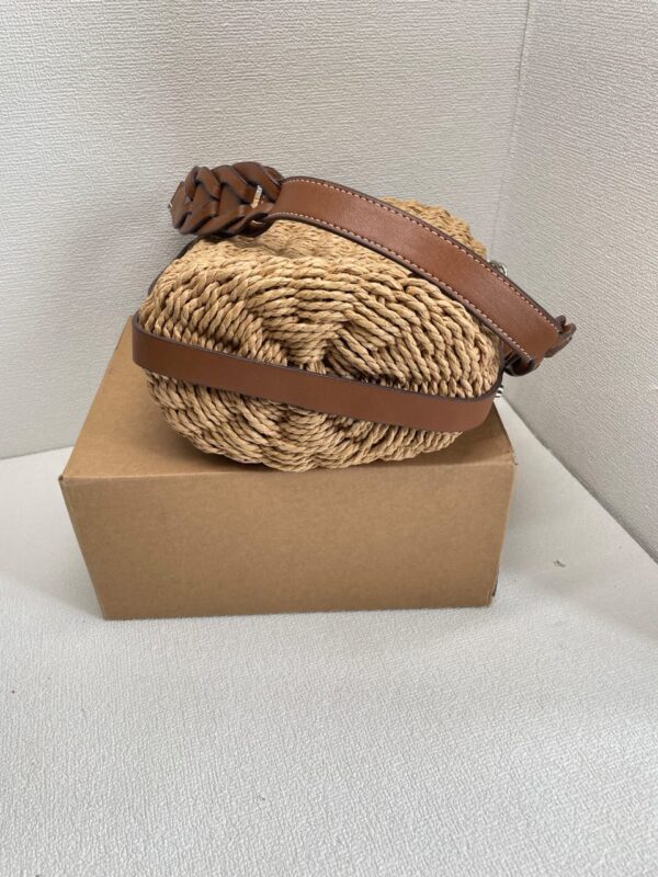 - Crocheted with raffia into the shape of a bucket, and then matched with a brown leather woven handle, as well as a triangular LOGO logo and side.