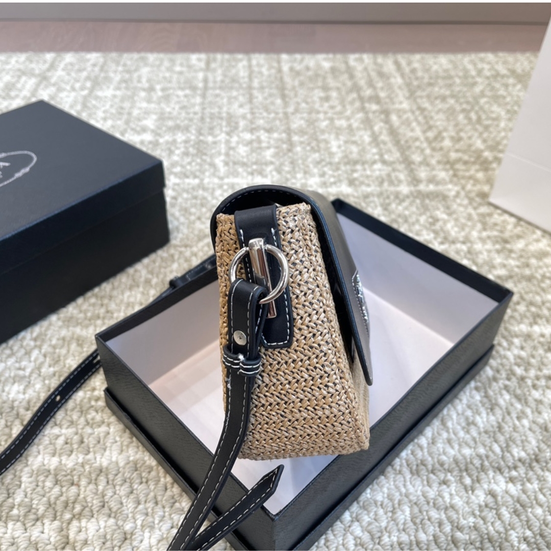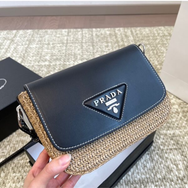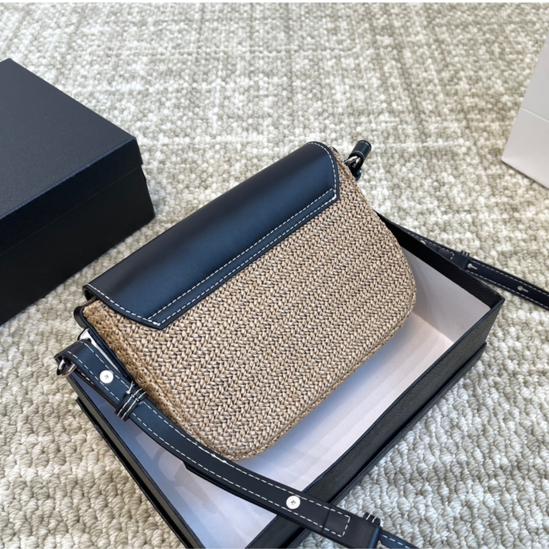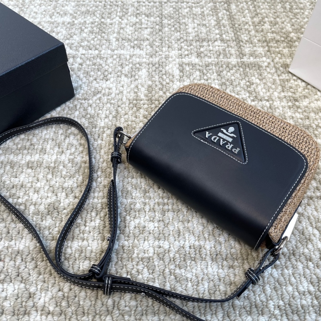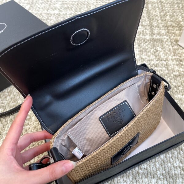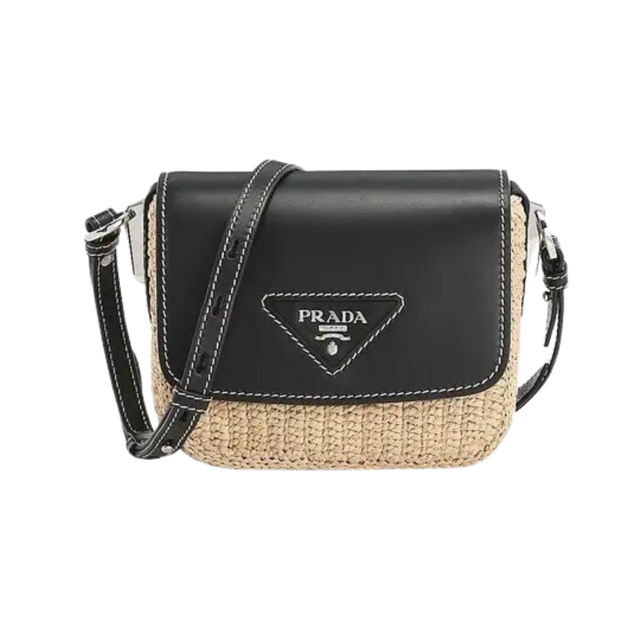 PRADA RAFFIA AND LEATHER CROSSBODY BAG NATURALE BLACK 20CM