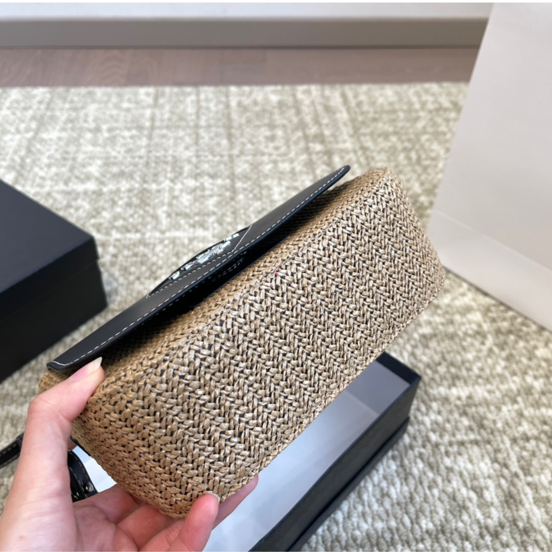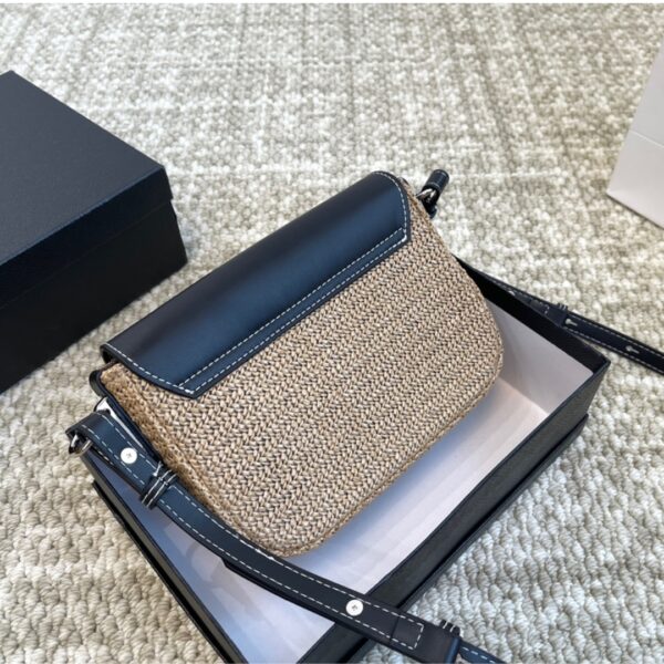 - Crossbody bag flaunts a leather flap and a woven raffia design
