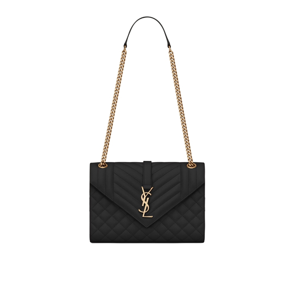 Saint Laurent Envelope Medium In Quilted Grain De Poudre Embossed Leather Black Gold 600185BOW911000 / 24cm / 9.4 inches